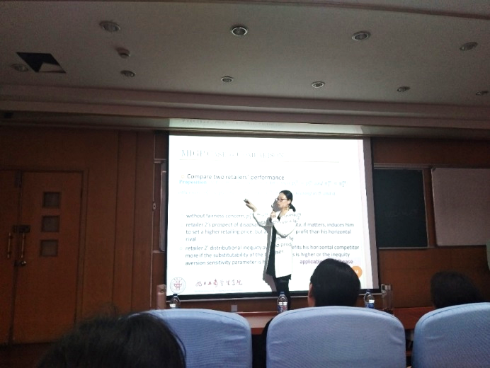 李庆颖老师的报告“Green Product Design with Competition and Fairness Concerns”则通过研究讨论确定了公平关切下的最优绿色投资决策和运营决策,并识别公平关切/零售竞争对供应链成员绩效的影响。