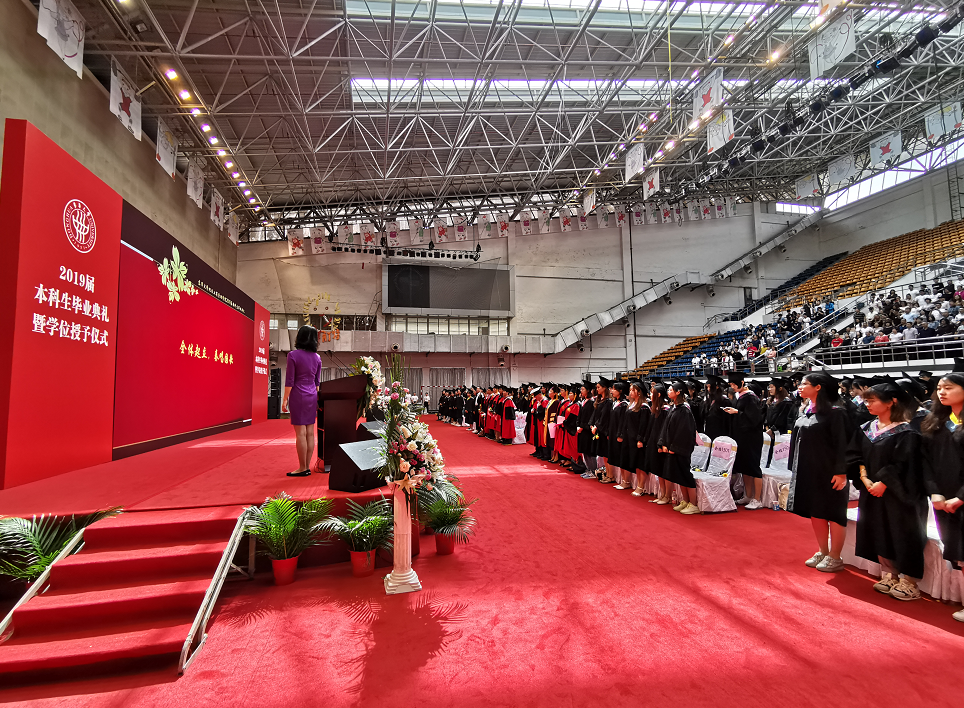 2019年6月25日上午,成人网址 2019届本科生毕业典礼暨学位授予仪式在延安路校区体育馆隆重举行。成人网址 党委副书记崔运花、成人网址 党委书记林文伟副教授、成人网址 院长徐寅峰教授、成人网址 副院长郑斐峰教授、成人网址 党委副书记丁怡副教授、成人网址 各系主任及部分教师代表出席毕业典礼。607名2019届毕业生和家长代表共同见证了这庄严的时刻。 当天上午9:00,毕业生们在毕业留言版处签名,然后踏着毕业红毯,怀着激动兴奋,又眷恋不舍的心情进入体育馆。 此次毕业典礼由成人网址 党委副书记丁怡主持。典礼在庄严的国歌声中拉开帷幕。