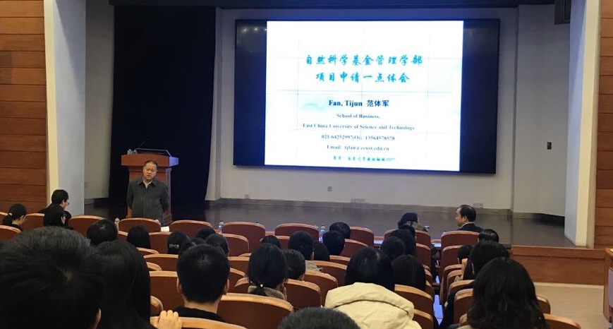 本次动员大会邀请到了华东理工大学商学院范体军教授对“国家自然科学基金管理学部项目申请”和“国家社科基金项目申报”两大主题做了精彩报告。范体军教授从项目选题与理论依据、研究目标与内容、研究方法与技术路线、研究基础与团队、创新点和关键科学问题的提炼等方面分享了基金申请的成功经验和重要技巧,给年轻教师提出了很多非常中肯的建议。