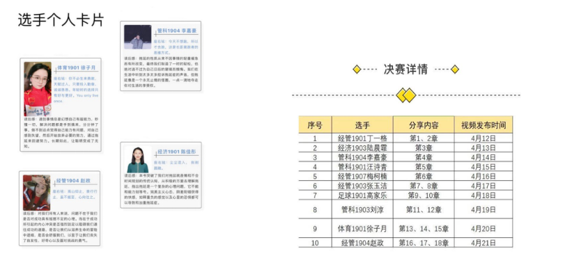 4月11日起推出活动预告,4月12日至4月21日连续十天,每天推送一位决赛选手的分享内容。评分标准为线上阅读量占比50%,评委打分占比50%,通过综合得分选出优胜的选手。正是由于每个人的全力以赴,才为我们带来出乎意料的惊喜效果。截至2020年4月23日24:00,此次活动推送易班阅览量2241次,微信阅览量7016次,“在看”人数178人。浏览量总数达到9257次。